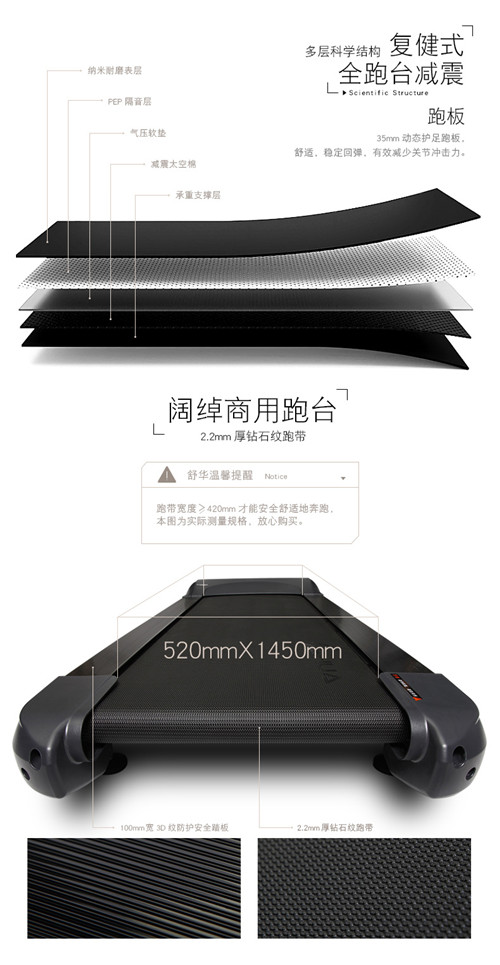 2、跑步机具有减震功能,尤其是锐强体育推荐的新X5跑步机,具有全跑台减震,独有专利减震技术,跑步时前脚舒适落地,后脚有力回弹,可有效缓解对膝盖及腿部的冲击力,让膝盖负担更小。