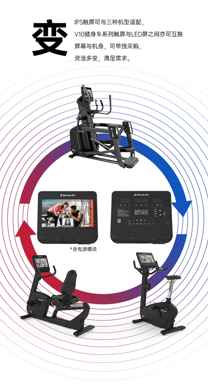 舒华立式商用健身车SH-B9100U(V10)触屏版拥有超大显示和操作屏幕, 可以任意设置阻力、时间和距离等参数,还可以即时显示心跳和转速等数据,同时,SH-B9100U提供多项科学运动处方,更轻松掌握运动节奏。